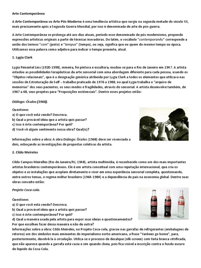 28/08/2019 · sua ideia de popularizar as obras de arte e introduzir a participação do público mostra como o artista estava inserido no contexto da arte conceitual... Esta é uma das primeiras obras feitas por joseph kosuth, da série "arte como idéia". As principais obras da artista contemporânea. Em 1974, leirner criticou o regime militar por meio da série "a rebelião dos animais", um relevante trabalho que fez com que o artista recebesse um prêmio como melhor proposta do ano. Era sobre a técnica, era sobre o palpável, era sobre a imagem... As principais obras da artista contemporânea.